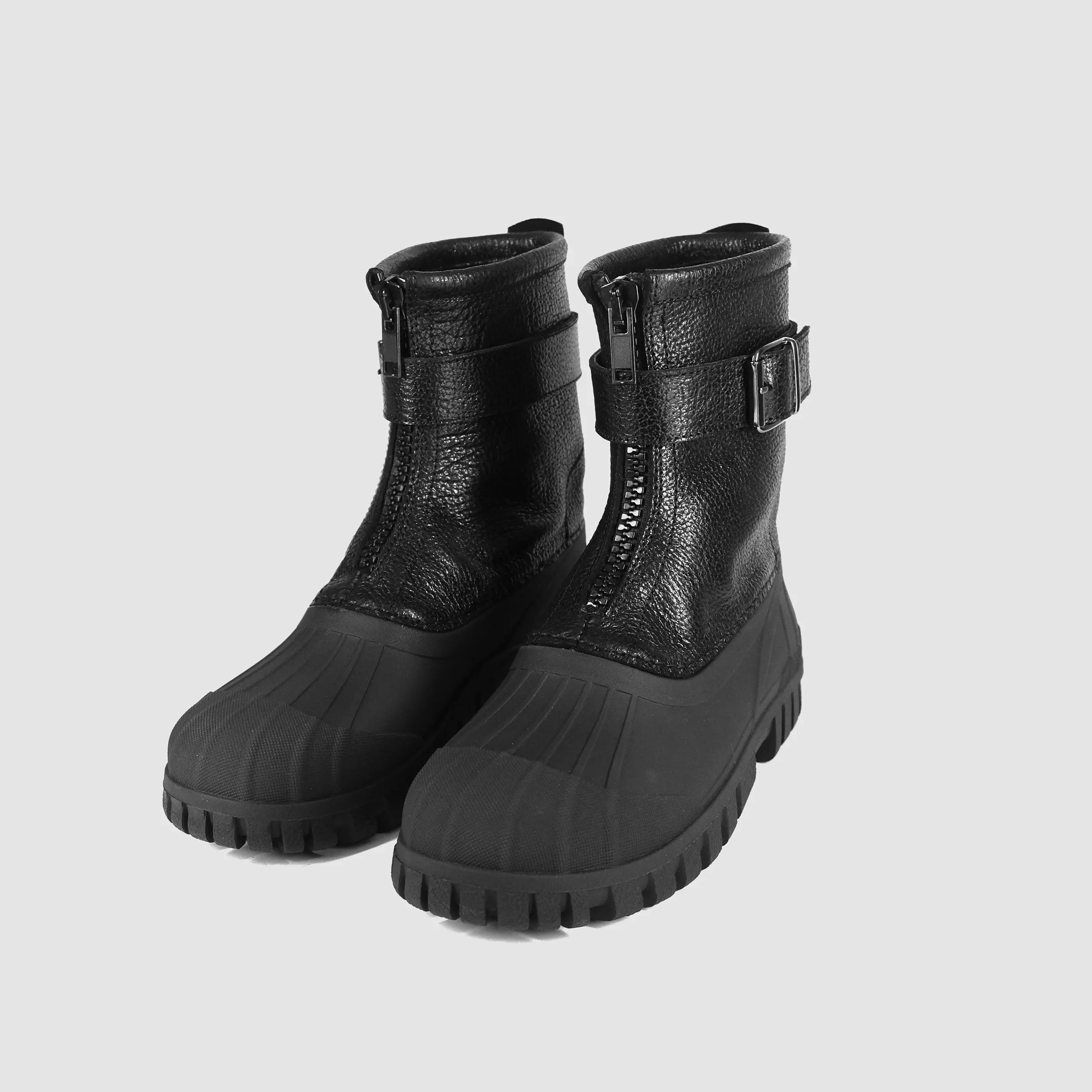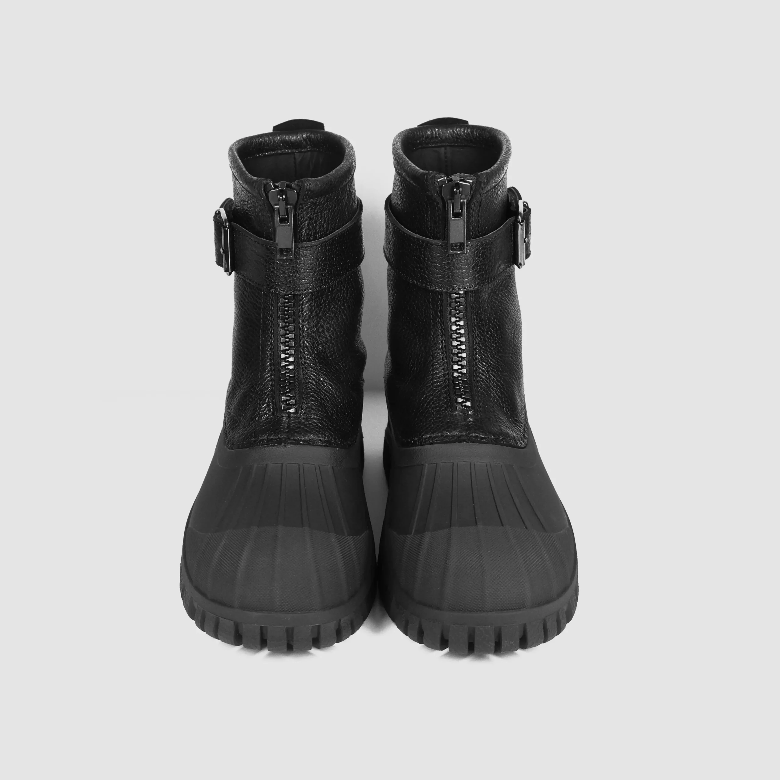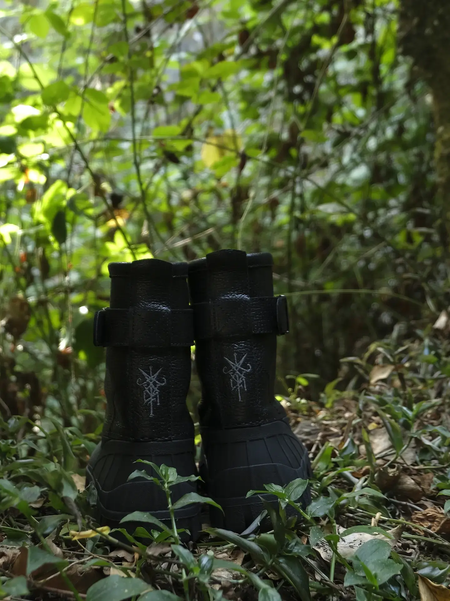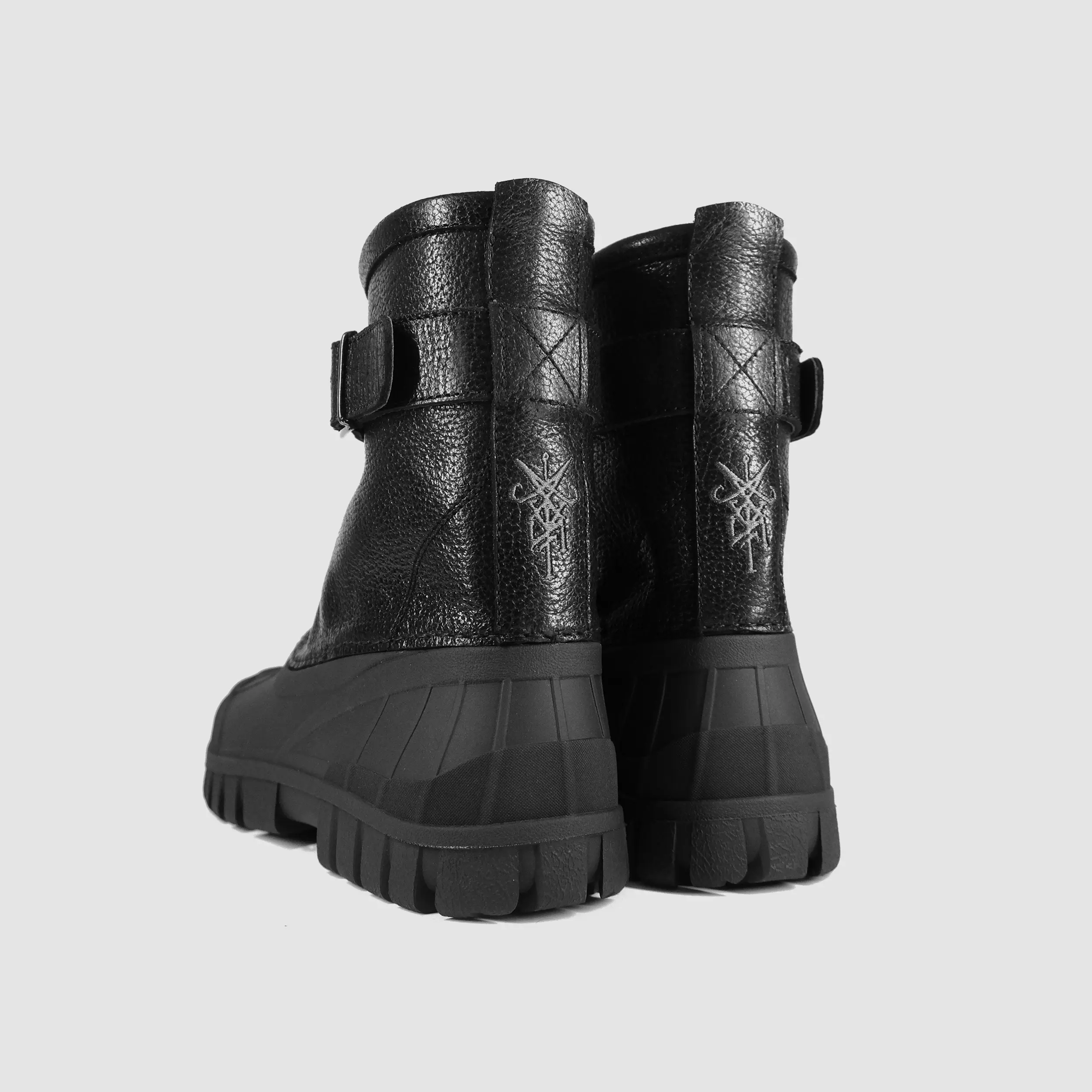 The Sutekh Hexen Boot. The first instalment of the Verge project, collaborating with the artists we love. Built on a shared set of specifications, the boot sits on a traditional duck sole which is stitched to a rugged upper fastening with a thick zip and side buckle. It features the Sutekh Hexen logo embroidered at the back. Sure to be the next go-to shoe for every casual outing. 100% calf leather upper, rubber sole.