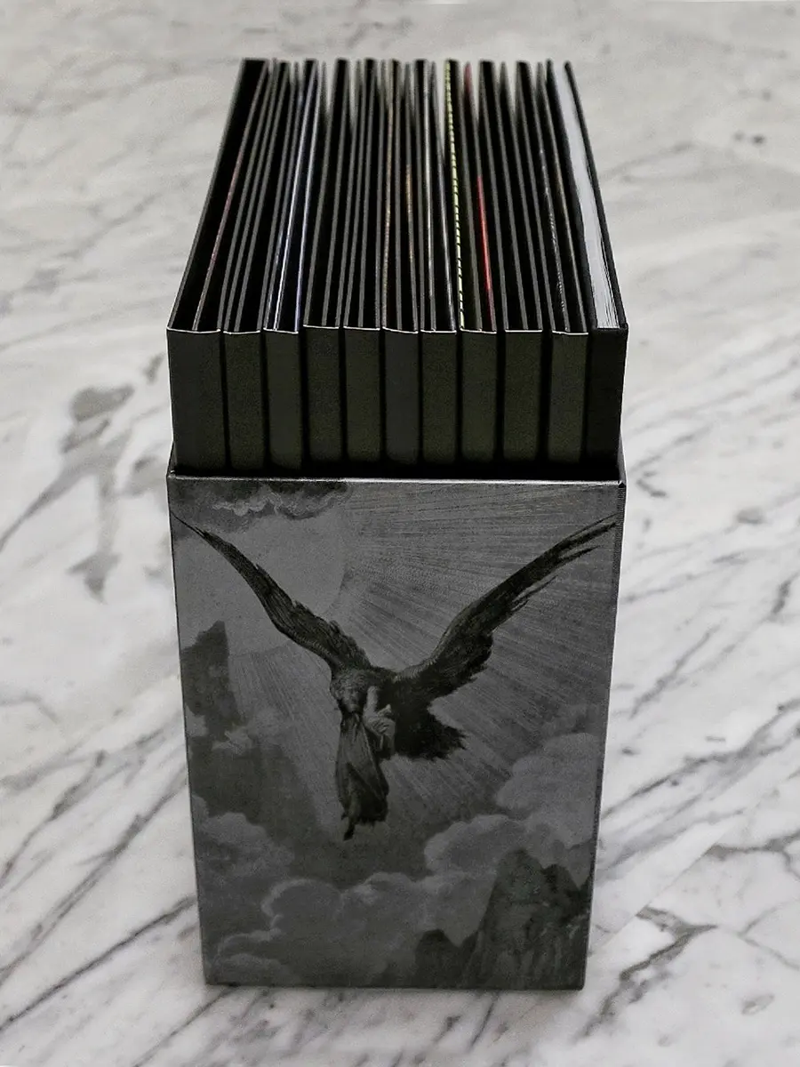 (Blood Music Emperor Complete Works) put together by now defunct Finnish label Blood Music, this stunning, limited box set was released in 2017 and covered the entire collective work of legendary band Emperor. Called by a fan as the 'box set to end all box sets', it comprised 24 x 12'' vinyl records and cost €700 originally. Many sets still being sold in Discogs.