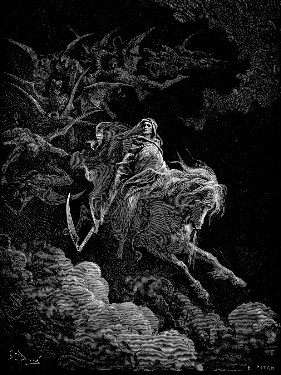 (Death On The Pale Horse) Gustave Doré's Death on The Pale Horse. Engraving, 1865. Death rides into the world on a pale horse. He is the fourth knight of the apocalypse. Hell follows him. A section of the engraving was used for Emperor's debut LP 'In The Nightside eclipse' and self-titled debut EP.